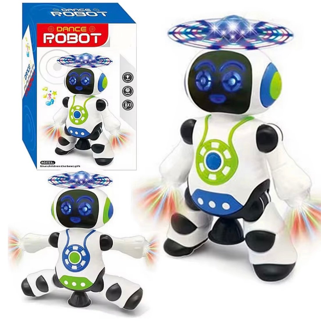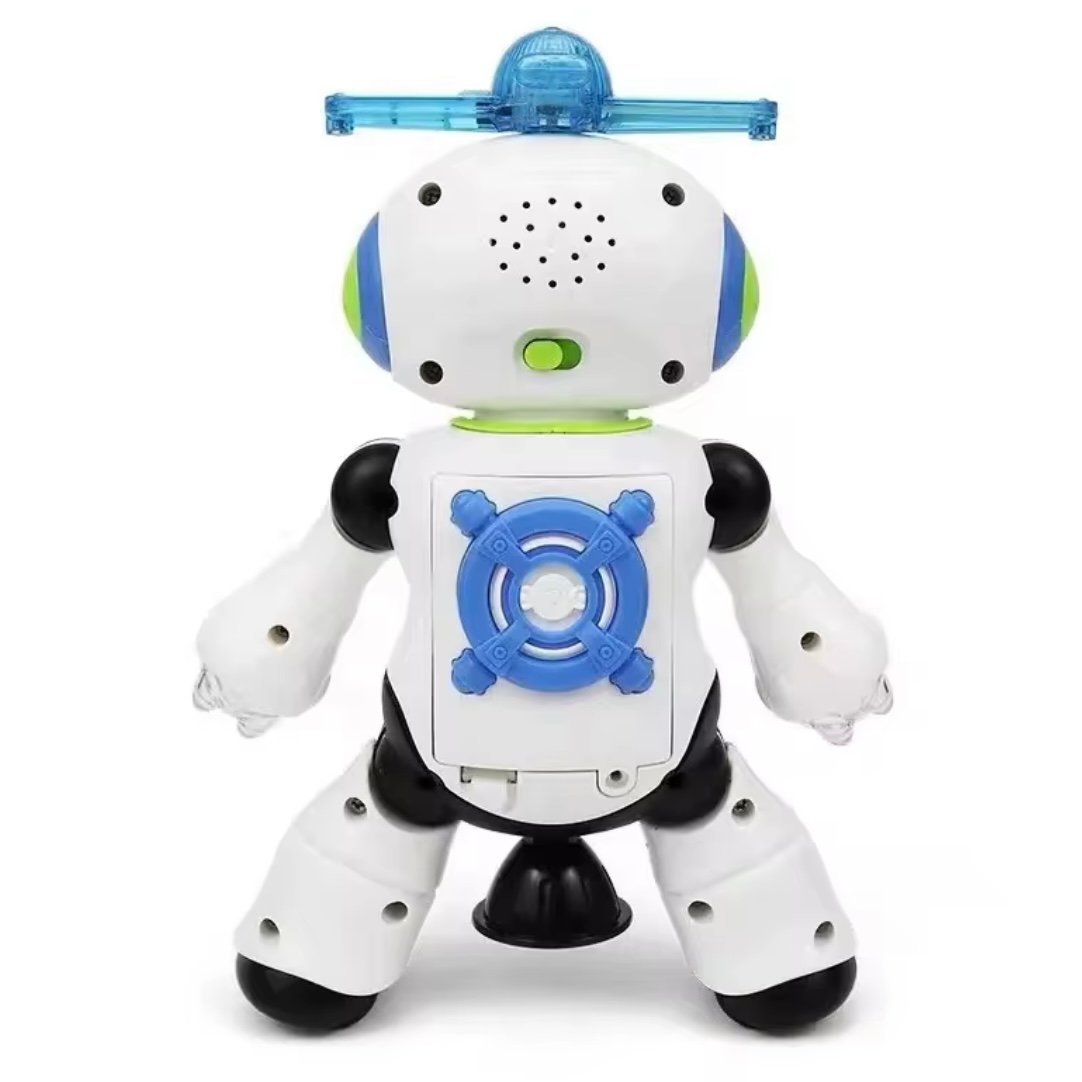 DANCE ROBOT — Robot Dansant Un petit danseur plein d’énergie ! Ce robot lumineux combine musique, mouvements amusants et effets LED pour émerveiller les enfants. Son design sécurisé stimule la coordination, la curiosité et l’imagination. À partir de : 8 mois Alimentation : fonctionne