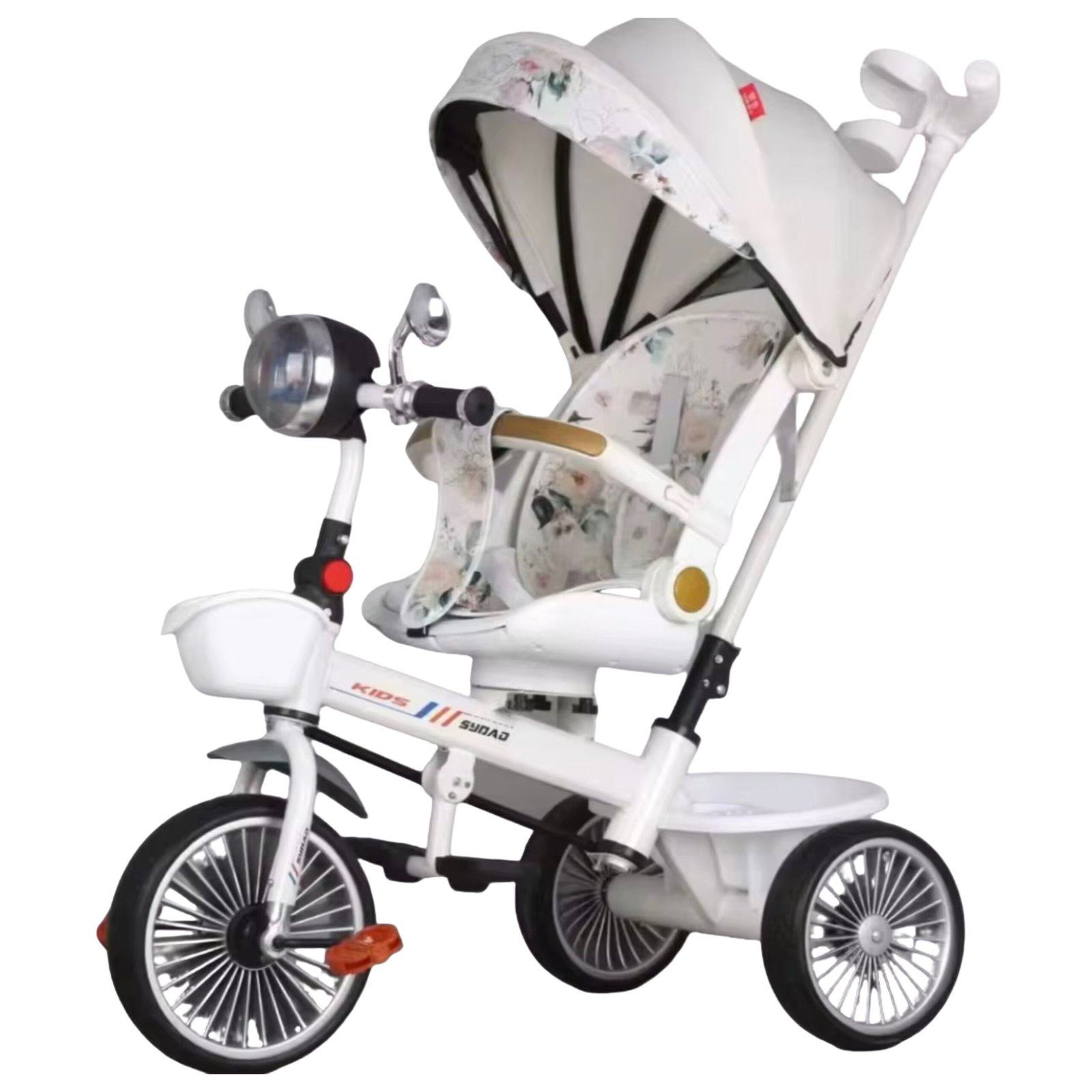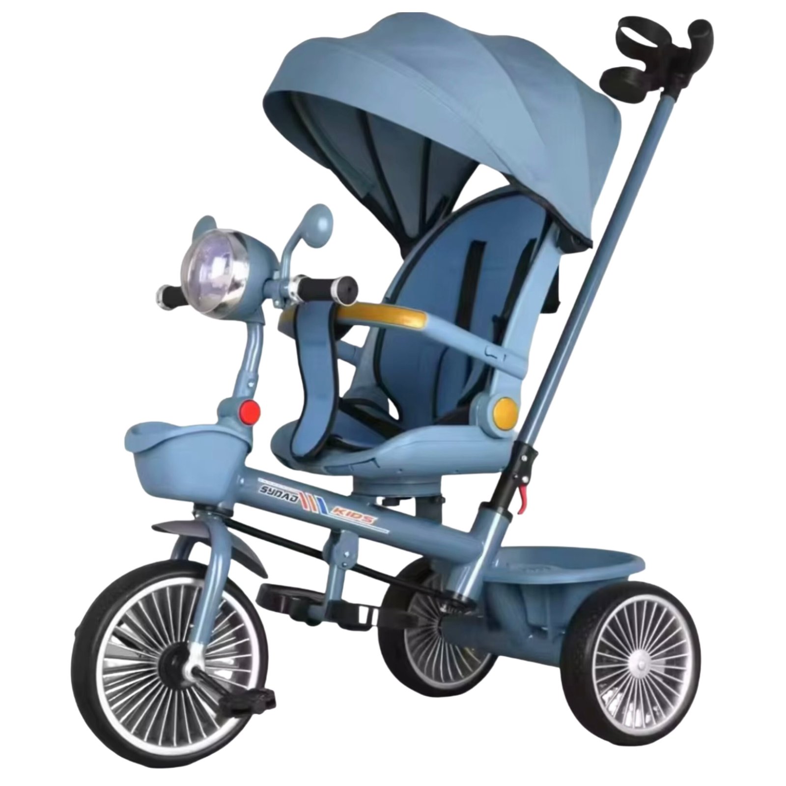 Tricycle évolutif alliant confort et sécurité : siège ergonomique avec harnais, barre de protection, guidon parental directionnel et capote pare-soleil. Roues stables et silencieuses + panier arrière pour emporter l’essentiel. Idéal pour les premières balades.